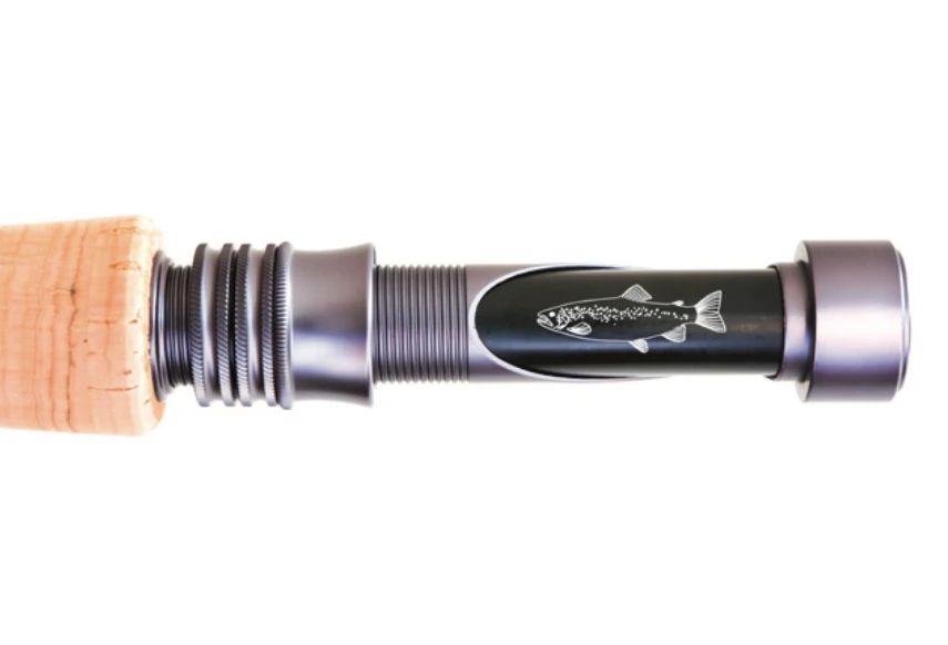 Reel seat: Screw-down style seat on longer rods – to improve balance at the wrist so minimizing fatigue). Made of 5040 anodized aluminum. The spacer has been laser engraved with a trout