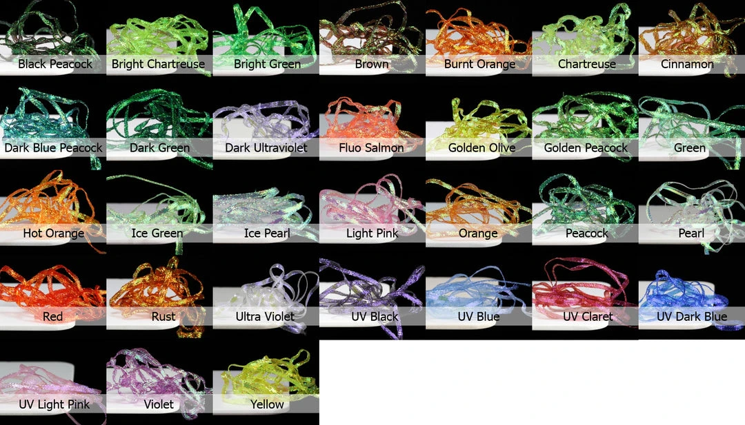 | Color | Black Peacock, Bright Chartreuse, Bright Green, Brown, Burnt Orange, Chartreuse, Cinnamon, Dark Blue Peacock, Dark Green, Dark Ultraviolet, Fluo Salmon, Golden Olive, Golden Peacock, Green, Hot Orange, Ice Green, Ice Pearl, Light Pink, Orange, Peacock, Pearl, Red, Rust, Ultraviolet, UV Black, UV Blue, UV Claret, UV Dark Blue, UV Light Pink, Violet, Yellow |