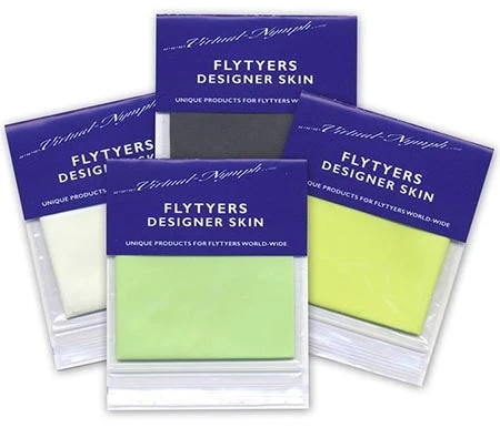 Flytyers Designer Skin is a synthetic elastic skin with a peel off white paper backing. Draw the shape required with a pencil or a pen and cut out with scissors, snap off the paper backing and use. This unique new product is only available from Virtual Nymph and is gaining an international reputation with some of the world’s best creative flytyers. Simple to use, just draw the shape and cut it out. An excellent product for cutting long strips with a straight edge for small segmented abdomens, round shapes for shrimp backs, tapered shapes for head capsule covers and thorax’s etc. Supplied as a 5 x 5 inch sheet and very thin. Flytyers Designer Skin will not snap under tension, does not fade and has been stabilized to prevent perishing. Flytyers Designer Skin can be colored with permanent markers to imitate realistic nymphs when matching the hatch.