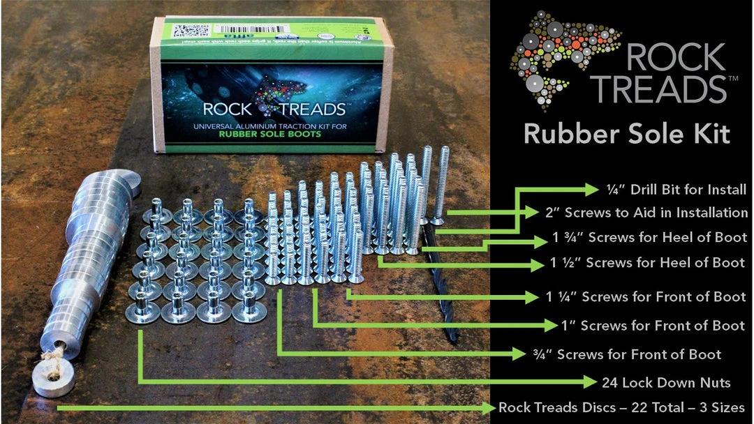 Simply put, Rock Treads are the best thing you can add to any boot, no matter the brand, for the best traction on the market today. Pick your kit based on your boot style, a simple install will assure a lifelong hold of your Rock Treads Aluminum Discs. Gone are your days of slipping and sliding. Works great on older boots with good uppers, but bad bottoms. All you do is drill it and bolt it!
