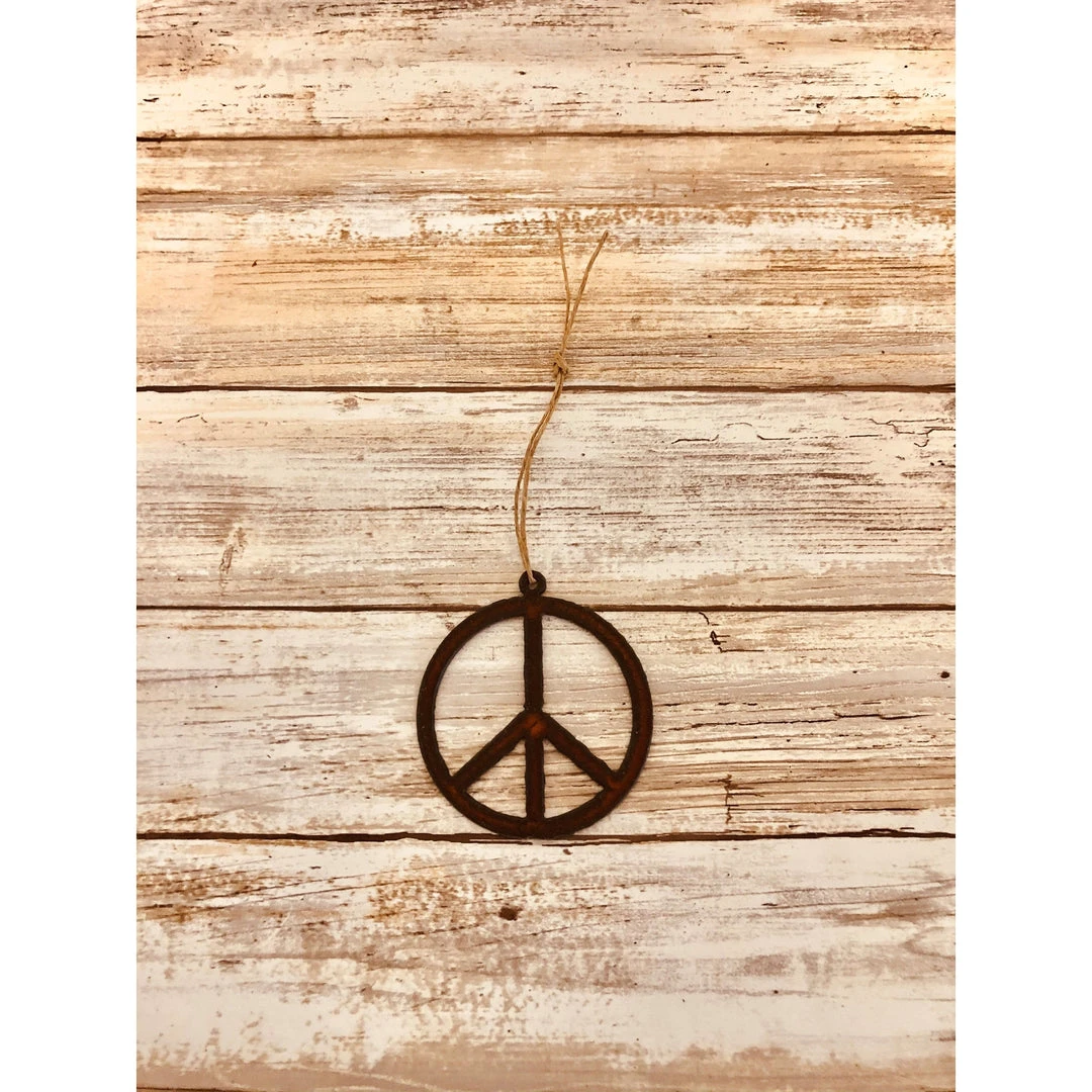 Peace symbol ornament. This Ornament is made with 18 Gauge Steel. Do to the Natural Rusting Process color may vary slightly, Made In Prescott Arizona
