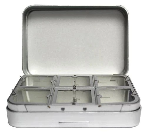 4608F – Black aluminum box with flat foam in the lid and 6 large and 4 small window compartments in the base. 6″ x 3 1/2″ x 1 1/8″
