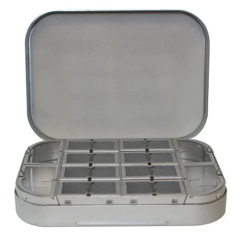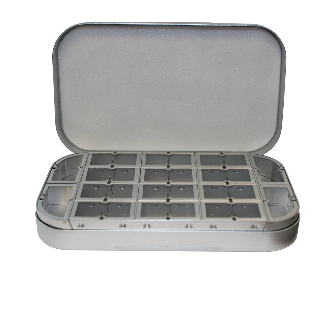 1607F – 16 compartments, flat foam in lid. 6″ x 3 1/2″ x 1 1/8″