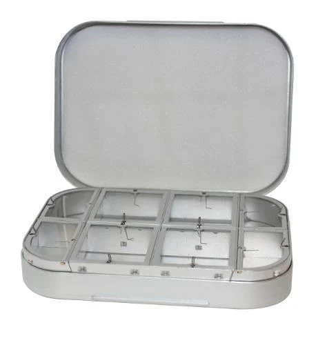 1408F – Flat foam in lid. 4 large and 4 small window compartments in base. 4 3/4″ x 3 1/2″ x 1 1/8″