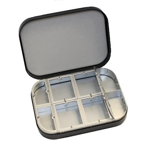 4408F – Black aluminum box with flat foam in the lid and 4 large and 4 small window compartments in the base. 4 3/4″ x 3 1/2″ x 1 1/8″