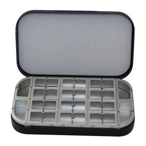 4607F – Black aluminum box with flat foam in lid and 16 window compartments in the base. 6″ x 3 1/2″ x 1 1/8″