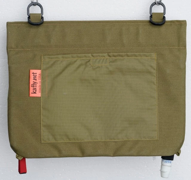 Behind the big pocket are 2 slots for Forceps or Mitten clamp (max 5.5″ length) and a hock file