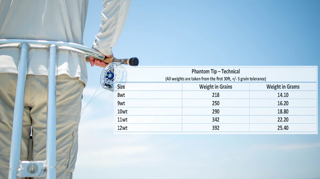 All Phantom Tip – Technical lines are weighted on the heavy side of the true AFFTA standards. You can see the weight ranges in the chart pictured here (weights are measured from the first 30 ft of the head).