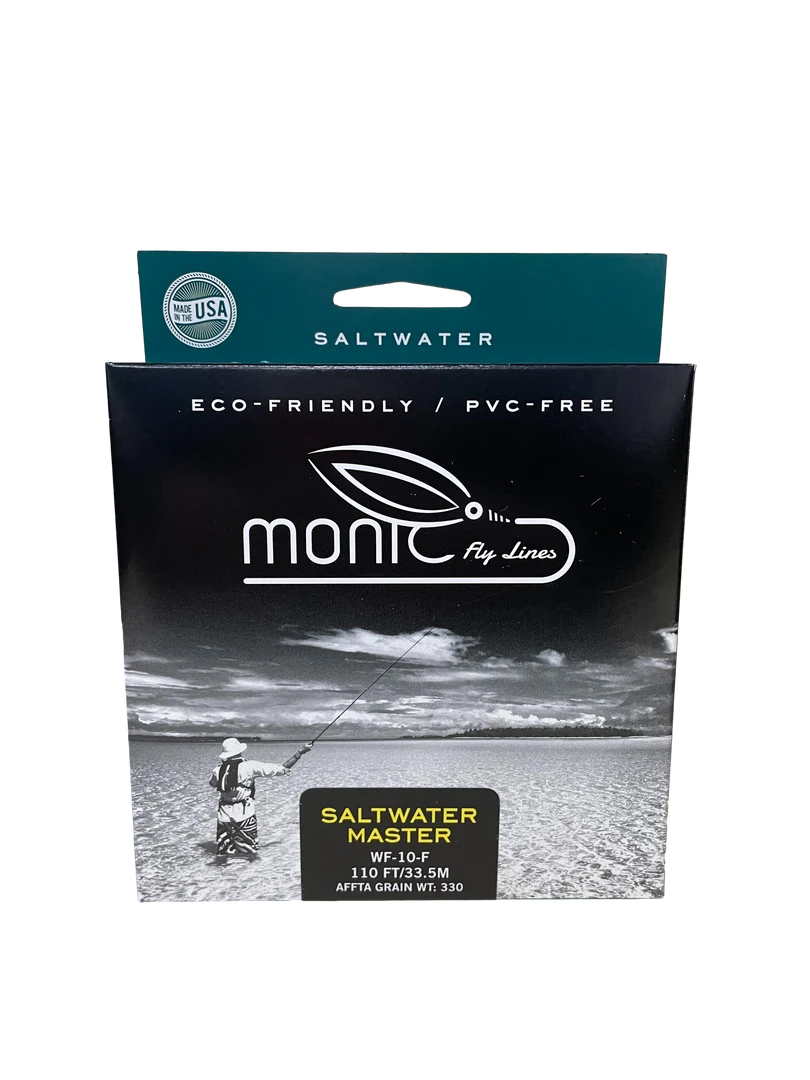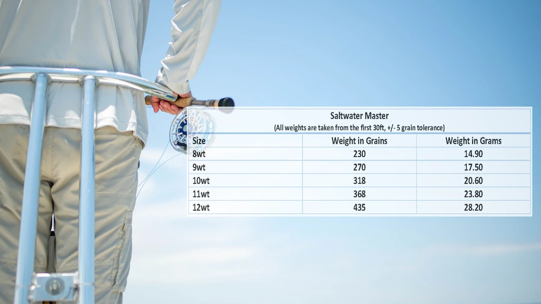 All Saltwater Masters are weighted a half size above the AFFTA standards. You can see the weight ranges in the chart pictured here (weights are measured from the first 30 ft of the head). All of our lines manufactured here at Monic are constructed at or just above the AFFTA standards.