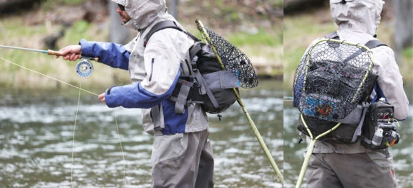 - Net Holster: Positioned on pack to accommodate left or right hand casting. Plastic reinforced webbing holds shape so you can slide net in and out easily, and makes carrying for long distances or over uneasy terrain easy!